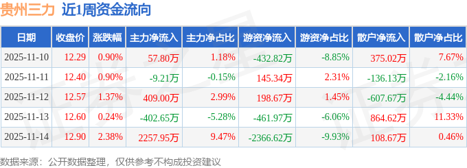 资金流向数据方面,本周贵州三力主力资金合计净流入2312.89万元,游资资金合计净流出2917.41万元,散户资金合计净流入604.52万元。本周资金流向一览见下表: