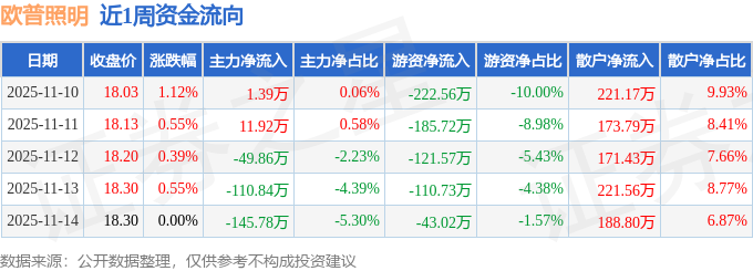 资金流向数据方面,本周欧普照明主力资金合计净流出293.17万元,游资资金合计净流出683.59万元,散户资金合计净流入976.76万元。本周资金流向一览见下表: