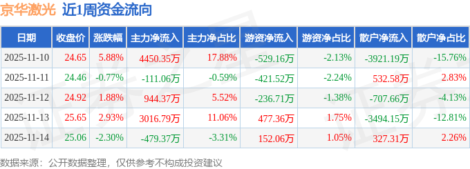 资金流向数据方面,本周京华激光主力资金合计净流入7821.08万元,游资资金合计净流出557.97万元,散户资金合计净流出7263.11万元。本周资金流向一览见下表:
