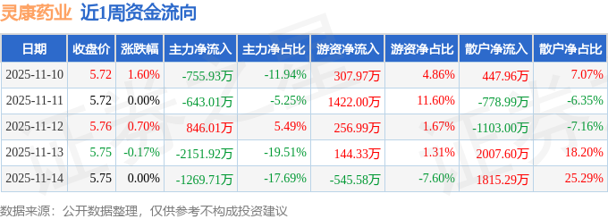 资金流向数据方面,本周灵康药业主力资金合计净流出3974.57万元,游资资金合计净流入1585.71万元,散户资金合计净流入2388.86万元。本周资金流向一览见下表: