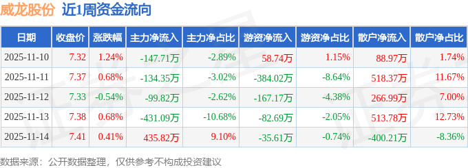 资金流向数据方面,本周威龙股份主力资金合计净流出377.15万元,游资资金合计净流出610.74万元,散户资金合计净流入987.9万元。本周资金流向一览见下表: