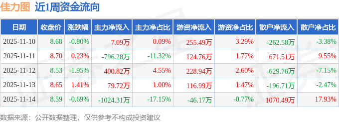 资金流向数据方面,本周佳力图主力资金合计净流出1332.96万元,游资资金合计净流入680.01万元,散户资金合计净流入652.95万元。本周资金流向一览见下表:
