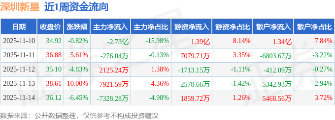 资金流向数据方面,本周深圳新星主力资金合计净流出2.49亿元,游资资金合计净流入1.86亿元,散户资金合计净流入6327.14万元。本周资金流向一览见下表: