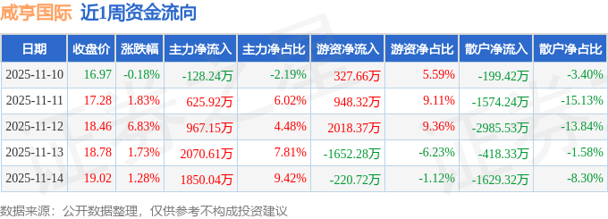 资金流向数据方面,本周咸亨国际主力资金合计净流入5385.48万元,游资资金合计净流入1421.35万元,散户资金合计净流出6806.84万元。本周资金流向一览见下表: