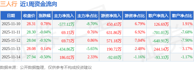 资金流向数据方面,本周三人行主力资金合计净流出687.08万元,游资资金合计净流入1751.5万元,散户资金合计净流出1064.42万元。本周资金流向一览见下表: