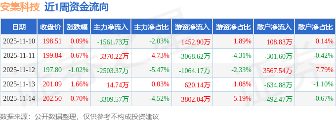 资金流向数据方面,本周安集科技主力资金合计净流出3989.71万元,游资资金合计净流入1742.29万元,散户资金合计净流入2247.42万元。本周资金流向一览见下表: