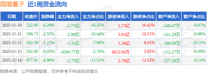 资金流向数据方面,本周国盾量子主力资金合计净流出13.24亿元,游资资金合计净流入13.34亿元,散户资金合计净流出961.26万元。本周资金流向一览见下表: