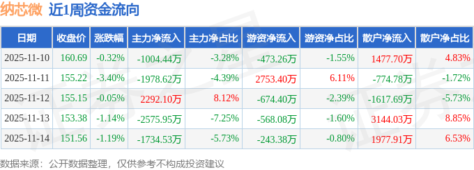 资金流向数据方面,本周纳芯微主力资金合计净流出5001.44万元,游资资金合计净流入794.28万元,散户资金合计净流入4207.16万元。本周资金流向一览见下表: