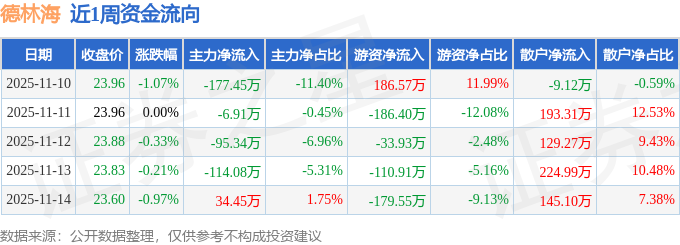资金流向数据方面,本周德林海主力资金合计净流出359.33万元,游资资金合计净流出324.23万元,散户资金合计净流入683.56万元。本周资金流向一览见下表: