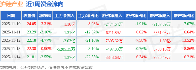 资金流向数据方面,本周沪硅产业主力资金合计净流出4.07亿元,游资资金合计净流入1.44亿元,散户资金合计净流入2.64亿元。本周资金流向一览见下表: