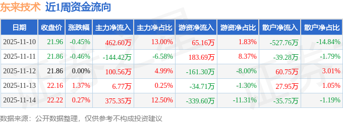 资金流向数据方面,本周东来技术主力资金合计净流入800.86万元,游资资金合计净流出286.77万元,散户资金合计净流出514.09万元。本周资金流向一览见下表: