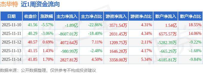 资金流向数据方面,本周杰华特主力资金合计净流出2.16亿元,游资资金合计净流入1.18亿元,散户资金合计净流入9816.69万元。本周资金流向一览见下表: