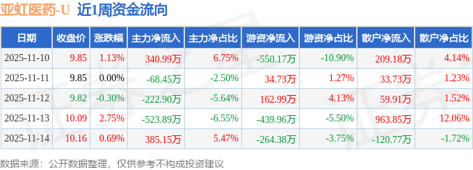 资金流向数据方面,本周亚虹医药主力资金合计净流出89.11万元,游资资金合计净流出1056.79万元,散户资金合计净流入1145.9万元。本周资金流向一览见下表: