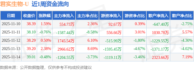 资金流向数据方面,本周君实生物主力资金合计净流入2474.9万元,游资资金合计净流出2581.22万元,散户资金合计净流入106.32万元。本周资金流向一览见下表: