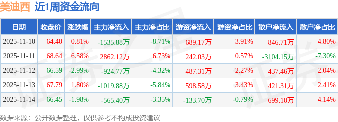 资金流向数据方面,本周美迪西主力资金合计净流出1183.81万元,游资资金合计净流入1883.39万元,散户资金合计净流出699.58万元。本周资金流向一览见下表:
