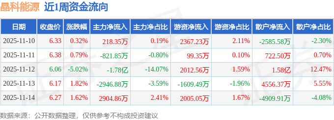 资金流向数据方面,本周晶科能源主力资金合计净流出1.84亿元,游资资金合计净流入4874.69万元,散户资金合计净流入1.36亿元。本周资金流向一览见下表: