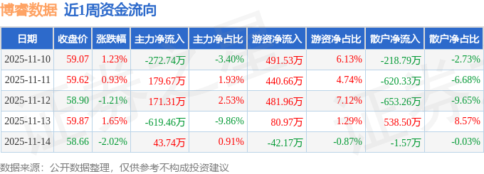 资金流向数据方面,本周博睿数据主力资金合计净流出497.49万元,游资资金合计净流入1452.95万元,散户资金合计净流出955.45万元。本周资金流向一览见下表: