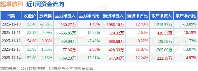 资金流向数据方面,本周超卓航科主力资金合计净流出1657.53万元,游资资金合计净流入2859.46万元,散户资金合计净流出1201.93万元。本周资金流向一览见下表: