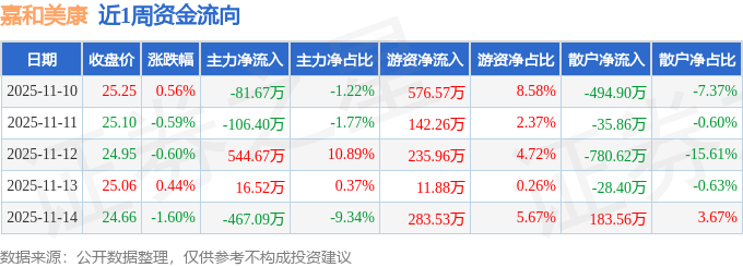 资金流向数据方面,本周嘉和美康主力资金合计净流出93.98万元,游资资金合计净流入1250.21万元,散户资金合计净流出1156.23万元。本周资金流向一览见下表: