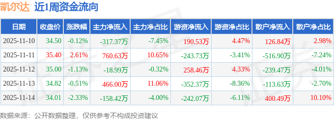 资金流向数据方面,本周凯尔达主力资金合计净流入731.85万元,游资资金合计净流出389.19万元,散户资金合计净流出342.66万元。本周资金流向一览见下表: