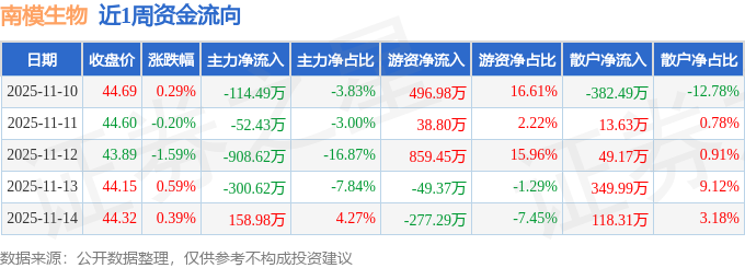 资金流向数据方面,本周南模生物主力资金合计净流出1217.19万元,游资资金合计净流入1068.58万元,散户资金合计净流入148.61万元。本周资金流向一览见下表: