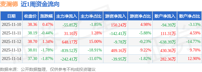 资金流向数据方面,本周麦澜德主力资金合计净流出458.52万元,游资资金合计净流入367.26万元,散户资金合计净流入91.25万元。本周资金流向一览见下表: