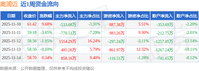 资金流向数据方面,本周奥浦迈主力资金合计净流入1513.53万元,游资资金合计净流入2318.86万元,散户资金合计净流出3832.39万元。本周资金流向一览见下表: