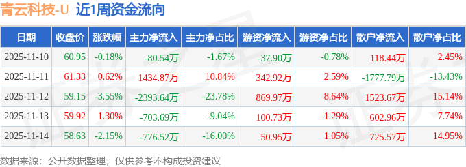 资金流向数据方面,本周青云科技主力资金合计净流出2519.51万元,游资资金合计净流入1326.66万元,散户资金合计净流入1192.85万元。本周资金流向一览见下表: