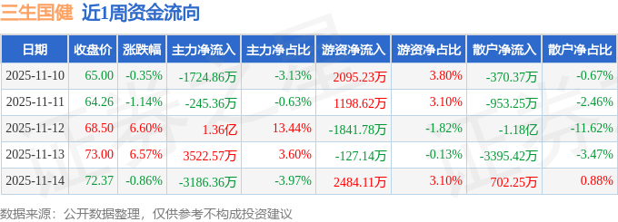 资金流向数据方面,本周三生国健主力资金合计净流入1.2亿元,游资资金合计净流入3809.04万元,散户资金合计净流出1.58亿元。本周资金流向一览见下表:
