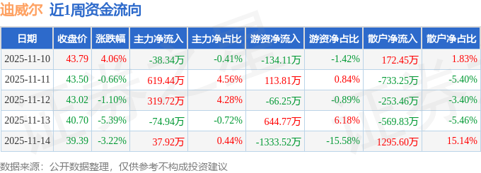 资金流向数据方面,本周迪威尔主力资金合计净流入863.8万元,游资资金合计净流出775.3万元,散户资金合计净流出88.5万元。本周资金流向一览见下表: