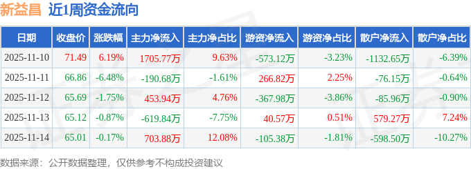 资金流向数据方面,本周新益昌主力资金合计净流入2053.07万元,游资资金合计净流出739.09万元,散户资金合计净流出1313.98万元。本周资金流向一览见下表: