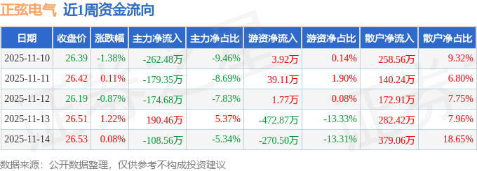 资金流向数据方面,本周正弦电气主力资金合计净流出534.62万元,游资资金合计净流出698.57万元,散户资金合计净流入1233.19万元。本周资金流向一览见下表: