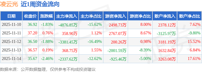 资金流向数据方面,本周凌云光主力资金合计净流出9868.27万元,游资资金合计净流入2539.01万元,散户资金合计净流入7329.26万元。本周资金流向一览见下表: