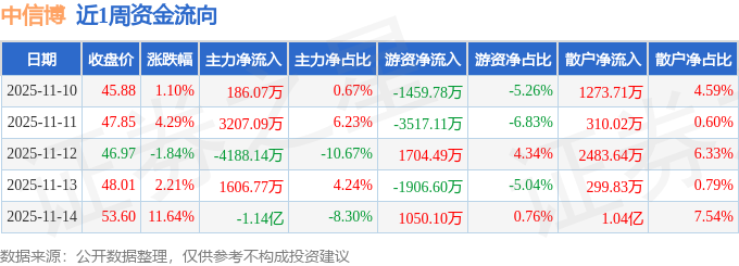 资金流向数据方面,本周中信博主力资金合计净流出1.06亿元,游资资金合计净流出4128.9万元,散户资金合计净流入1.48亿元。本周资金流向一览见下表:
