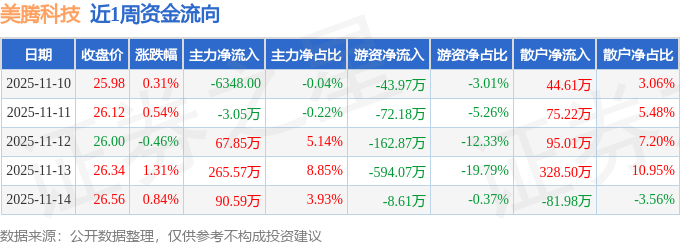 资金流向数据方面,本周美腾科技主力资金合计净流入420.34万元,游资资金合计净流出881.7万元,散户资金合计净流入461.37万元。本周资金流向一览见下表: