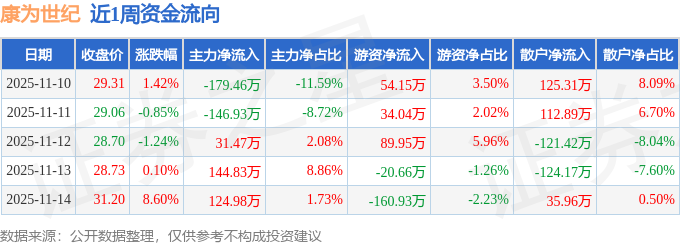 资金流向数据方面,本周康为世纪主力资金合计净流出25.1万元,游资资金合计净流出3.46万元,散户资金合计净流入28.56万元。本周资金流向一览见下表: