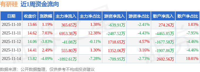 资金流向数据方面,本周有研硅主力资金合计净流入5941.14万元,游资资金合计净流出766.67万元,散户资金合计净流出5174.47万元。本周资金流向一览见下表: