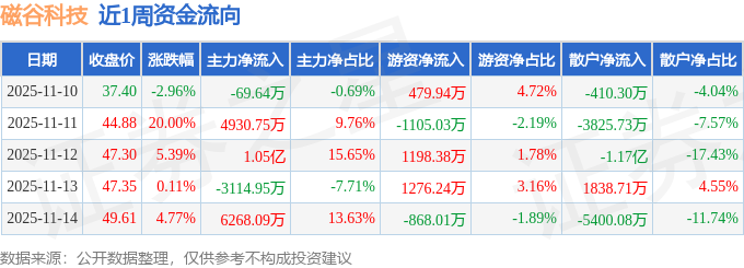 资金流向数据方面,本周磁谷科技主力资金合计净流入1.85亿元,游资资金合计净流入981.52万元,散户资金合计净流出1.95亿元。本周资金流向一览见下表: