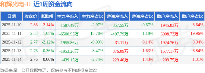 资金流向数据方面,本周和辉光电主力资金合计净流出1.24亿元,游资资金合计净流出128.74万元,散户资金合计净流入1.26亿元。本周资金流向一览见下表: