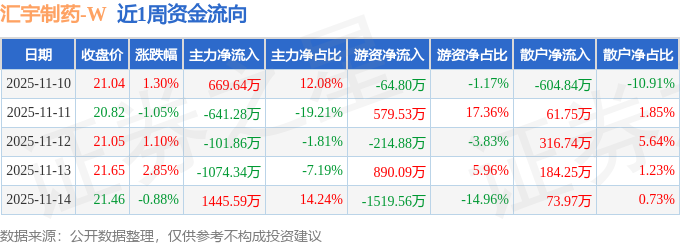 资金流向数据方面,本周汇宇制药主力资金合计净流入297.76万元,游资资金合计净流出329.62万元,散户资金合计净流入31.86万元。本周资金流向一览见下表: