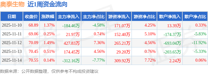 资金流向数据方面,本周奥泰生物主力资金合计净流入127.63万元,游资资金合计净流入927.81万元,散户资金合计净流出1055.44万元。本周资金流向一览见下表: