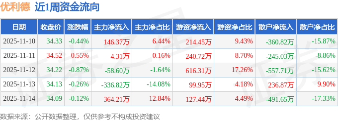 资金流向数据方面,本周优利德主力资金合计净流入119.47万元,游资资金合计净流入1298.87万元,散户资金合计净流出1418.34万元。本周资金流向一览见下表: