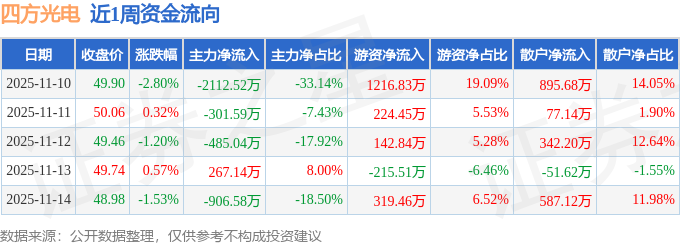 资金流向数据方面,本周四方光电主力资金合计净流出3538.59万元,游资资金合计净流入1688.07万元,散户资金合计净流入1850.52万元。本周资金流向一览见下表: