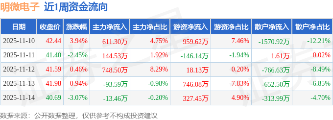 资金流向数据方面,本周明微电子主力资金合计净流入1397.28万元,游资资金合计净流入1905.14万元,散户资金合计净流出3302.42万元。本周资金流向一览见下表:
