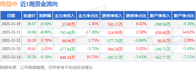 资金流向数据方面,本周同益中主力资金合计净流出56.38万元,游资资金合计净流入377.37万元,散户资金合计净流出320.99万元。本周资金流向一览见下表:
