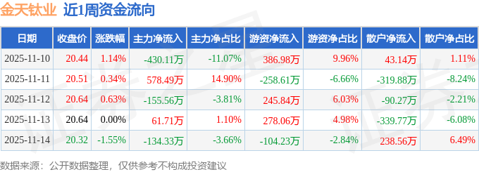 资金流向数据方面,本周金天钛业主力资金合计净流出79.8万元,游资资金合计净流入548.03万元,散户资金合计净流出468.22万元。本周资金流向一览见下表: