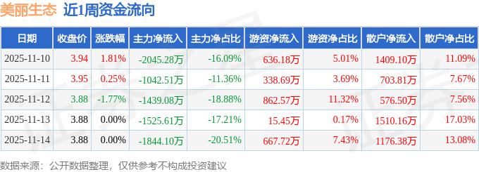 资金流向数据方面,本周美丽生态主力资金合计净流出7896.57万元,游资资金合计净流入2520.62万元,散户资金合计净流入5375.95万元。本周资金流向一览见下表: