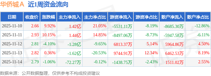 资金流向数据方面,本周华侨城A主力资金合计净流出396.9万元,游资资金合计净流入1091.37万元,散户资金合计净流出694.47万元。本周资金流向一览见下表: