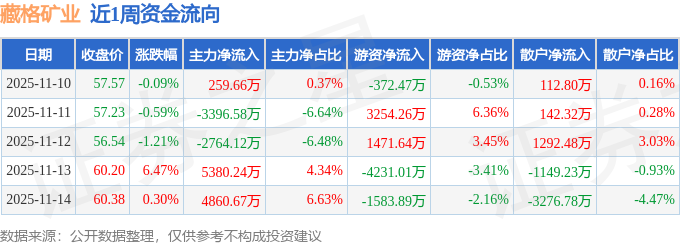 资金流向数据方面,本周藏格矿业主力资金合计净流入4339.89万元,游资资金合计净流出1461.48万元,散户资金合计净流出2878.41万元。本周资金流向一览见下表: