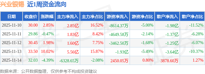 资金流向数据方面,本周兴业银锡主力资金合计净流入11.21亿元,游资资金合计净流出3.35亿元,散户资金合计净流出7.85亿元。本周资金流向一览见下表: